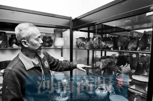 “這個(gè)是商代的鬲,這個(gè)是漢代的陶,這個(gè)是五代時(shí)期的玉枕……”河南鄭州某小區(qū),在59歲敬勤儉的家中,說(shuō)起展示柜中的藏品,他一臉的寵溺。“漂亮著呢”“好看得很”是他說(shuō)到這些寶貝時(shí)用得最多的話(huà),這些都是敬勤儉在近20年里撿來(lái)的。