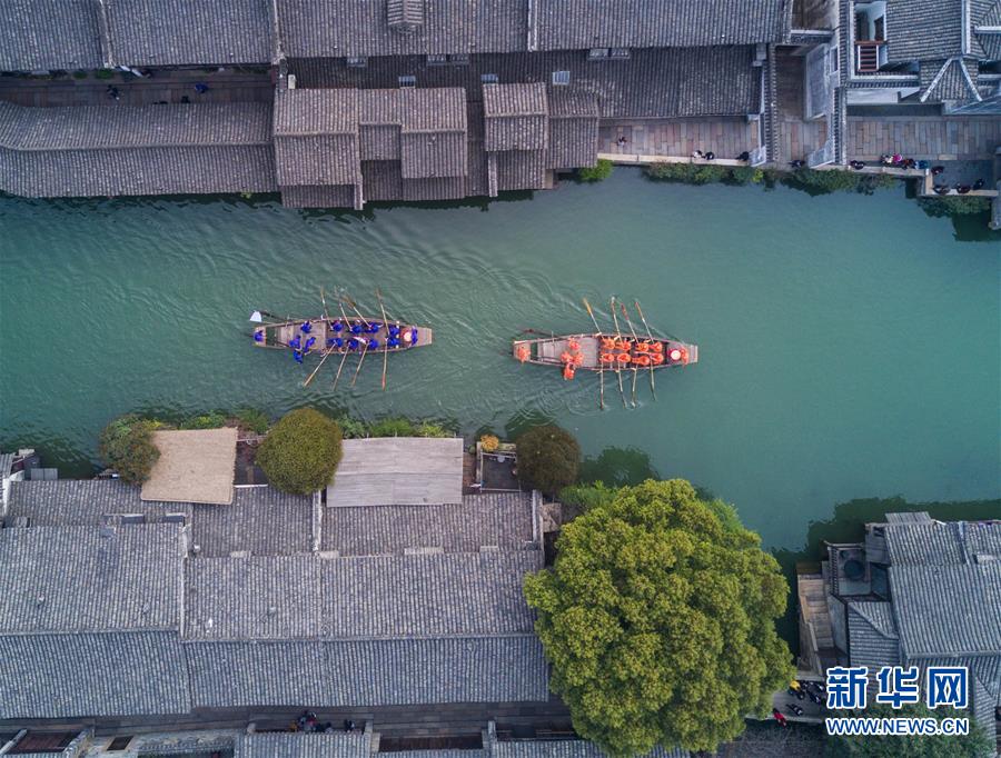 3月29日,烏鎮(zhèn)水鄉(xiāng)百姓在烏鎮(zhèn)西柵景區(qū)參加名為“踏白船”的傳統(tǒng)水上競技活動(dòng),吸引游客前來感受水鄉(xiāng)獨(dú)特的民俗風(fēng)情?!疤ぐ状备傎惖哪康氖菫榱似砬笮Q桑豐收。