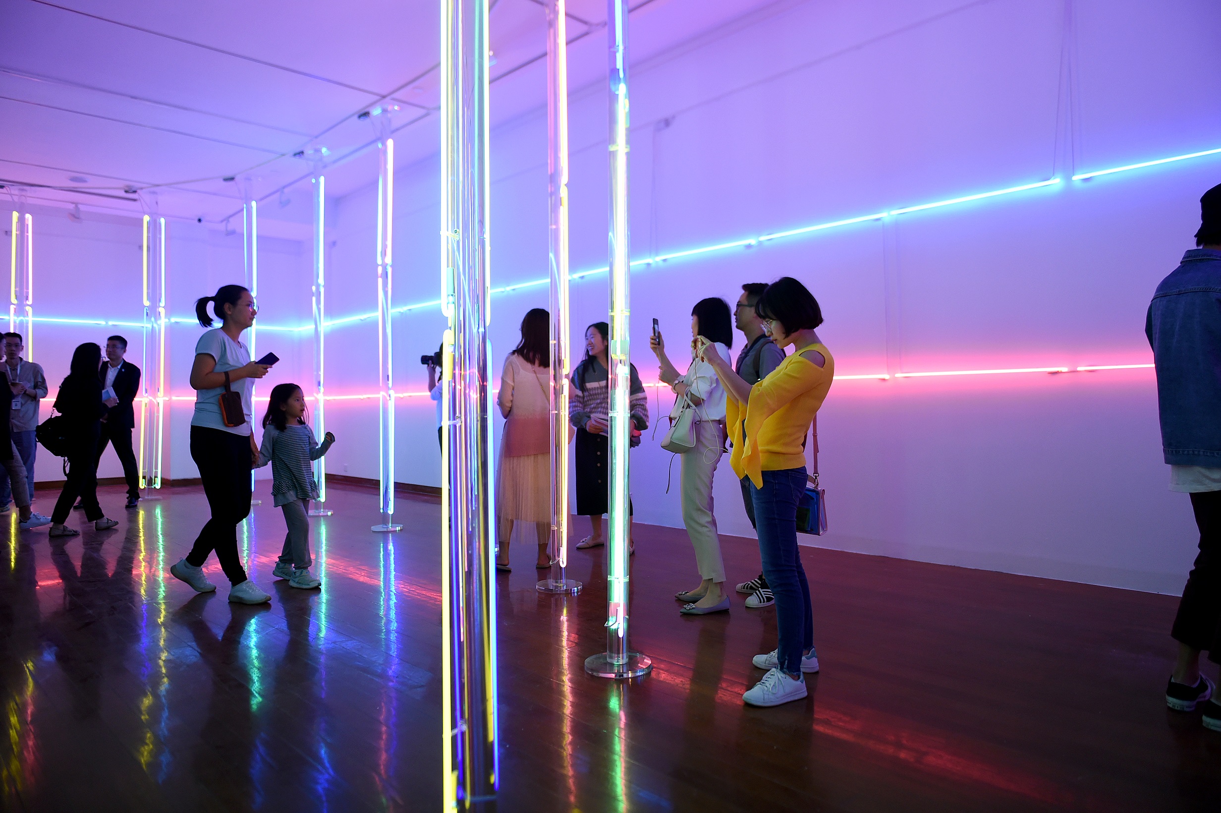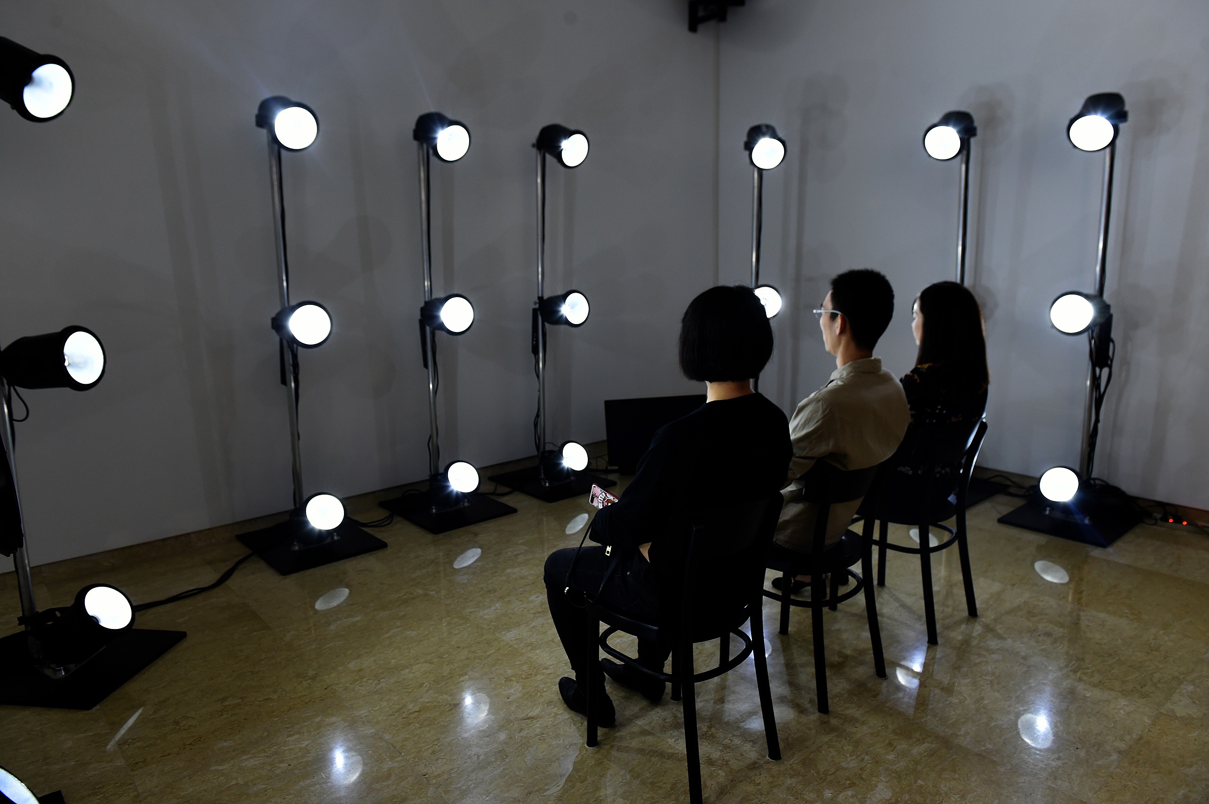 很多觀眾排隊(duì)體驗(yàn)丹麥館的《斷電》,它由27根頻閃觀測(cè)器燈圍著三張座椅。觀眾坐下,閉上眼睛……通過(guò)預(yù)設(shè)好的燈光順序,閉上眼睛眼前將會(huì)呈現(xiàn)幾乎會(huì)引起幻覺的燈光圖案。同音樂一起,制造了一場(chǎng)浸入式的感官體驗(yàn)。通過(guò)調(diào)動(dòng)眼球與大腦的敏感性,看它們?nèi)绾萎a(chǎn)生視覺“斷電”。
