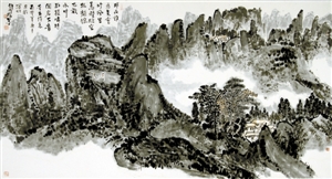 王和平不僅能書(shū)寫(xiě)2尺的大字,還能寫(xiě)篆書(shū)、隸書(shū)、行書(shū)、草書(shū)、楷書(shū),他尤其擅長(zhǎng)以指書(shū)寫(xiě)長(zhǎng)線(xiàn)條幅,還能書(shū)寫(xiě)小到1寸左右的楷書(shū)、行書(shū)、草書(shū)等各種書(shū)體。“從他的《黃山系列》,我看到了一個(gè)堅(jiān)強(qiáng)的古典腳步,追尋在范寬的《谿山行旅途》中,沐李唐的《萬(wàn)壑松風(fēng)圖》,聽(tīng)馬遠(yuǎn)的《踏歌圖》……一個(gè)精美絕倫的藝術(shù)時(shí)代遠(yuǎn)逝而去,念天地之悠悠,獨(dú)愴然而涕下。留幽幽懷古者,追憶圣賢高士清歌古琴于卷軸中的絕美風(fēng)騷。王和平和我都是這個(gè)幽幽懷古者,追求高貴古典精神的尋賢之人?!边@是評(píng)論家豐川在他的《心有千像,十指墨弦》一文中評(píng)價(jià)王和平的指書(shū)所述。