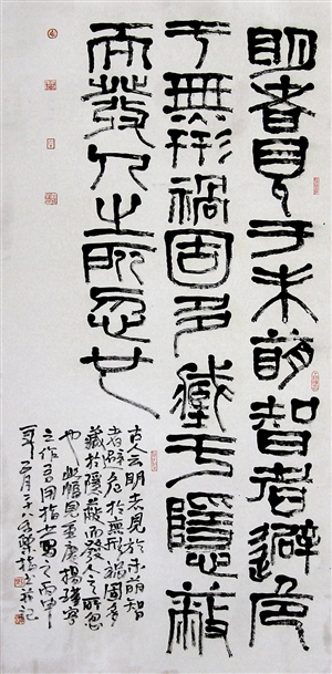 王和平以手指蘸墨,以手為筆,或疾或緩,不到十分鐘,一幅恰似石鑿雕刻力透紙背的書(shū)法作品躍然紙上,其變幻莫測(cè)的創(chuàng)作手法和獨(dú)特風(fēng)格令人叫絕。顯然,用手指畫(huà)的難度比用筆畫(huà)大得多。一般書(shū)寫(xiě)一個(gè)字需要用手指蘸墨幾次以上,但又必須使字形整體合理自然,筆畫(huà)形式流暢靈動(dòng),不至于顯露手工痕跡,不至于給人以呆滯和工藝性強(qiáng)的感覺(jué)。要恰到好處地體現(xiàn)筆畫(huà)的緊湊、粗細(xì)、虛實(shí)、枯榮,是一件很不容易的事。功夫全在指頭,既非一日之功,也非人人可以練就。