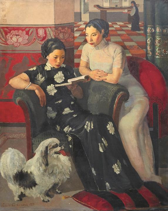 《客廳中的姐妹》畫面鮮艷,人物明媚,藝術(shù)家是以妻子為模特,描繪出她在家中客廳讀書的美態(tài)。據(jù)紅梅教授介紹,畫中兩姐妹的形象,實(shí)為常書鴻妻子陳芝秀一人,只是她穿著不同衣服入畫。精于學(xué)院派古典主義繪畫技法的藝術(shù)家,在純熟的技巧中飽蘸深情,把妻子?jì)寡诺娜粘C璁嫷妹涝沼圃?。中式美人倚坐西式油畫中,東西雜糅,搖曳生姿。