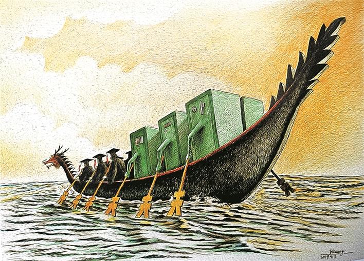 上榜漫畫家鄧微觀系深圳市寶安區(qū)打鐵文藝社社長(zhǎng),其《感物系列》以見(jiàn)物興感為主線,展開(kāi)豐富的想象力,用動(dòng)物擬人的方式幽默詼諧地抒發(fā)人生感悟,讓人會(huì)心一笑之余引起共鳴,令觀眾感嘆藝術(shù)家的漫無(wú)邊際的“腦洞”。對(duì)于作品首次入選國(guó)內(nèi)美術(shù)界規(guī)格最高的國(guó)展,鄧微觀很興奮:“這是對(duì)我這個(gè)系列作品的高度肯定?!薄陡形锵盗小废盗凶髌吩从谒e逛發(fā)呆時(shí)的想象碎片,將這個(gè)碎片貫穿就成了這個(gè)系列作品。鄧微觀在茶余飯后經(jīng)常到鐵崗的西鄉(xiāng)河邊散步,河中不時(shí)傳來(lái)低頻厚實(shí)的“男低音”引起他的注意,此起彼伏,聽(tīng)來(lái)如交響曲一般通達(dá)舒暢。他循聲尋覓,原來(lái)是蛤蟆的聲音,只見(jiàn)這些“音樂(lè)家”在下水道洞口,在草叢中,河道縫中快樂(lè)地歡唱……這些天生的樂(lè)觀者給鄧微觀帶來(lái)美妙的心情,所以創(chuàng)作了這幅《天生樂(lè)觀》。再如《三餐之余》,有時(shí)飯后經(jīng)常會(huì)在茶幾前發(fā)發(fā)呆,思考人生不應(yīng)該只是面包和蘋果,還應(yīng)有點(diǎn)別的……