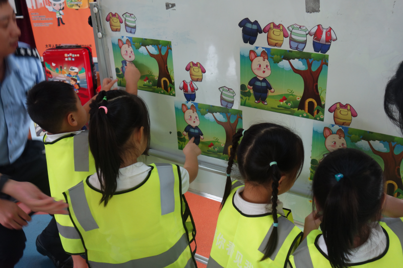熊警官從交通工具講起,分別講述了乘坐不同交通工具所帶來的風險及注意事項,并通過幽默風趣的“兒童安全座椅”小視頻,提醒在座的小朋友及家長要注意細節(jié),具有防范風險的意識。在互動游戲環(huán)節(jié),熊警官通過與小朋友們的互動,講解了紅綠燈的來源、日常的交通標識以及過馬路的規(guī)則。現(xiàn)場的同學們也非常踴躍,在“被看見才安全”環(huán)節(jié)時,許多小朋友主動上臺,給小兔子穿上最亮最顯眼的衣服,使其成為最靚的仔。