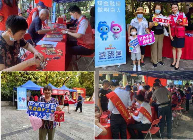 在白沙嶺社區(qū)公園廣場,浦發(fā)銀行深圳分行的工作人員通過懸掛印有金融知識的宣傳橫幅、標語、播放宣傳片、張貼宣傳海報、擺放金融知識宣傳品,以及發(fā)放、講解宣傳折頁方式,以圖文并茂的形式向社區(qū)居民宣講金融基礎(chǔ)知識,傳授防范非法金融活動的風險提示。針對老年人群體,該行印制了《2021年金融知識宣傳老年版》折頁,重點向老年人宣講理財與儲蓄的差別、老年人投資理財4大原則等金融知識。同時,該行還精心設(shè)計了互動環(huán)節(jié),通過金融知識問答卡片、水彩圖畫DIY、燈籠制作DIY、主題拼圖體驗等方式,吸引社區(qū)居民主動參與到金融知識學習中。