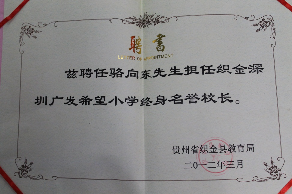 2013年,在駱向東的退休儀式上,織金縣教育局將一張希望小學終身名譽校長的聘書,鄭重交到了他的手上?!拔液軜s幸能代表廣發(fā)銀行深圳分行黨委去推動這件事,但公益事業(yè)任重道遠,我相信愛心基因會在廣發(fā)一直傳承下去?!笔聦嵰舱珩樝驏|所言,從1998年籌建希望小學至今,一代代廣發(fā)人身體力行,讓愛心助學一棒接力一棒。