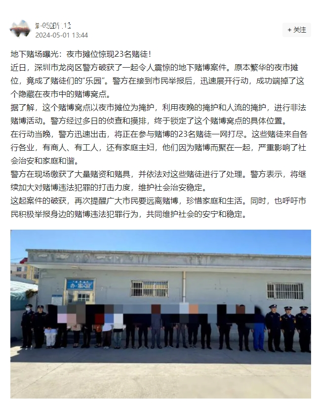 有網民在某社交平臺發(fā)帖稱:“近日,深圳市龍崗區(qū)破獲了一起令人震驚的地下賭博案件。原本繁華的夜市攤位,竟成了賭徒們的‘樂園’。”龍崗區(qū)相關部門第一時間對該內容進行核查,確認此消息不實,龍崗區(qū)沒有發(fā)生此類案件。
