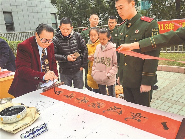 當(dāng)日,來到現(xiàn)場的書畫家有林明川、葉自力、黃漢明、劉振海、賴福豪、唐伯龍、葉生茂、鄧日龍、陳思羽9位,由于桌子數(shù)量有限,書畫家們還輪流上場,搞起了“筆墨接力”。前來圍觀、求字求畫的官兵以及家屬們絡(luò)繹不絕。最受歡迎的是題寫“福”字和春聯(lián)。臨近春節(jié),大家都想求一個好意頭。書畫家們對官兵、家屬們的要求,來者不拒,全情滿足。