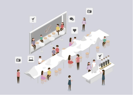 ? 喜茶白日夢計劃“相遇”、“山溪澗”、“山外山”構(gòu)成一場大型空間實(shí)驗,你可以自由地“一人小憩”,也可以制造“二人時光”的浪漫,還可享受“多人相聚”的歡樂。三家DP店都運(yùn)用了鏡面反射的設(shè)計手法,其中“ 相遇”是平整不銹鋼的鏡面,反襯桌面不同群組人們的活動場景,空間明亮開闊的同時,讓人們體驗到在喜茶門店中新的相遇方式。