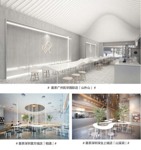 店中的桌子做成浮云形狀,山成為桌子的一部分,與天頂?shù)纳叫伟咨⌒雾斉镞b相呼應(yīng),“山外山”主題呼之欲出。喜茶·山外山的設(shè)計靈感來源于兩幅古畫——《春山瑞松圖》和《溪山行旅》。設(shè)計師把畫中的“山峰”感融入店內(nèi),現(xiàn)代化的同時富有詩意。讓茶客仿佛置身畫中,大夢一場,不知身在何方。