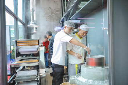 一般的越南河粉店用的是進(jìn)口貨,就算來(lái)源再好,在運(yùn)輸過程中總有味道和韌度的流失。傳統(tǒng)河粉機(jī)屬于大型設(shè)備,蔡瀾團(tuán)隊(duì)經(jīng)過22個(gè)月的研發(fā)和改良,縮小尺寸才能將機(jī)器陳列于餐廳,讓顧客見證新鮮河粉生產(chǎn)制作的全過程:大米浸泡至軟,石磨磨成米漿再蒸熟、切割成河粉,用心打造出一碗新鮮美味的Pho。