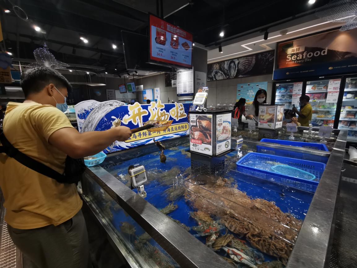 上市第一天,等待已久的市民們爭相購買嘗鮮。盒馬廣東門店的梭子蟹價格49.9元/斤,周日早上11點不到,第一波入缸的海鮮已經被搶空,門店迅速補貨。