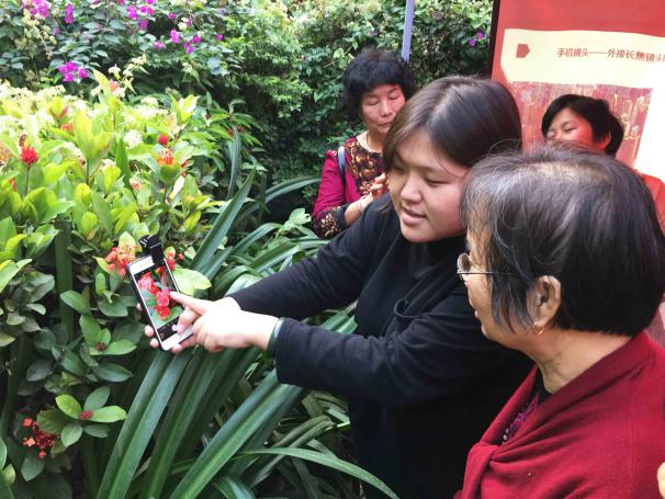 市民們在講解員指導(dǎo)下練習(xí)手機攝影