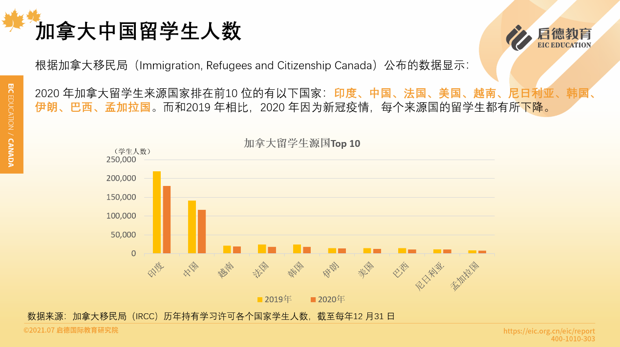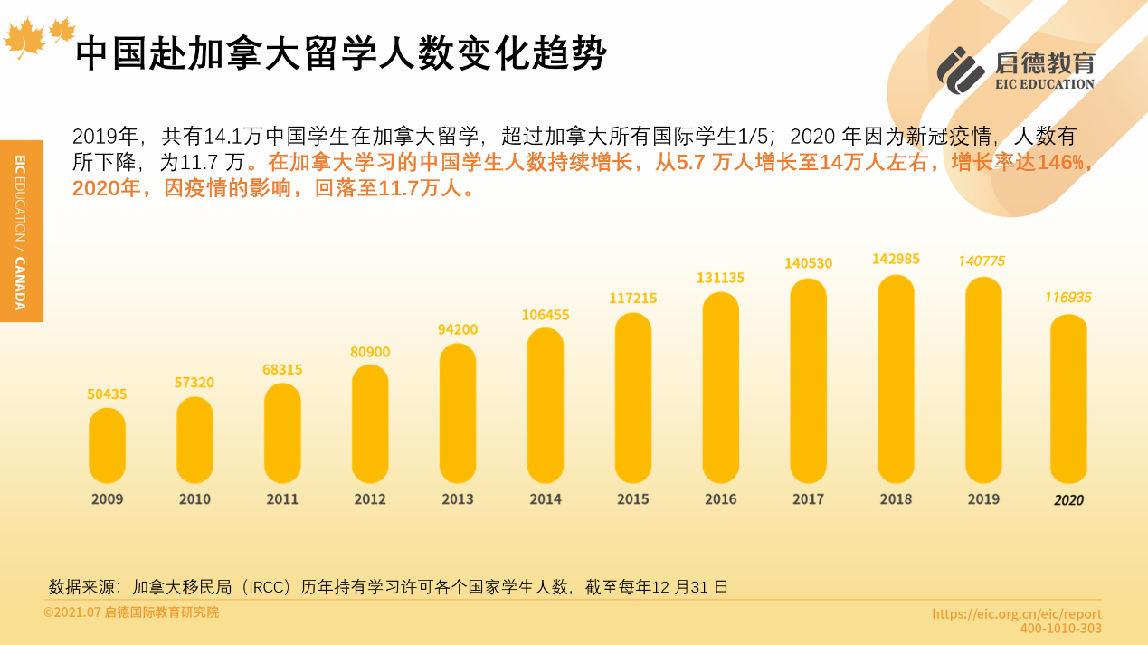 據(jù)加拿大移民局(IRCC)公布的數(shù)據(jù)顯示,2020年加拿大留學(xué)生來源國家排在前10位分別是:印度、中國、法國、美國、越南、尼日利亞、韓國、伊朗、巴西、孟加拉國。從2010年到2020年的11年間,在加拿大學(xué)習(xí)的中國學(xué)生人數(shù)持續(xù)增長,從5.7萬人增長至14萬人左右,增長率達146 %,2020年,因疫情的影響,回落至11.7萬人。