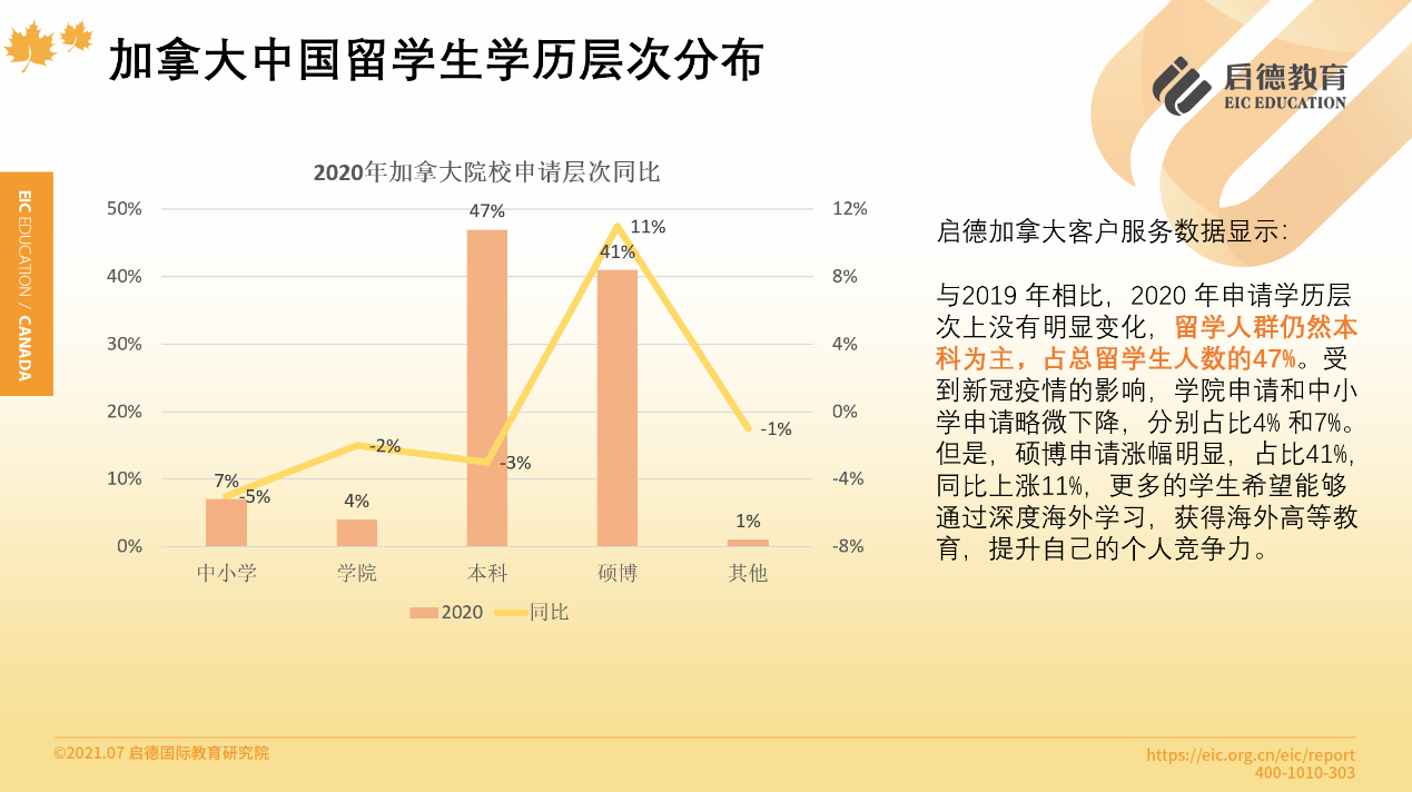 加拿大移民局數(shù)據(jù)顯示,2020年入學(xué)的中國內(nèi)地學(xué)生中,大學(xué)(本、碩、博)階段占比為23.4%,學(xué)院占比7.4%,中小學(xué)占比55%。啟德留學(xué)客戶服務(wù)數(shù)據(jù)顯示,2020年通過啟德申請加拿大留學(xué)的學(xué)生中,本科與碩博的學(xué)生占比分別為47%與41%,學(xué)院和中小學(xué)分別占比4%與7%。