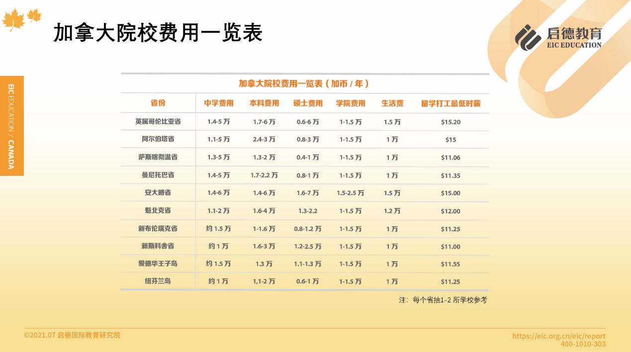 加拿大統(tǒng)計局數(shù)據(jù)顯示,2019-2020學(xué)年加拿大國際留學(xué)生,本科平均學(xué)費為29714加幣 /年 (同比上學(xué)年增漲7.6% ),約合16萬人民幣/年;碩士平均學(xué)費水平為17744加幣 /年(同比上學(xué)年增漲4% ),約合10萬人民幣/年;生活費1萬 -1.5萬加幣 /年,約合5.2萬-7.9萬人民幣/年,總留學(xué)費用在美、英、澳、加四大熱門留學(xué)目的國中最低。此外,加拿大公立中學(xué)學(xué)費、生活費用共約14萬人民幣 /年,國際私立中學(xué)共約20萬人民幣 /年,私立本地精英中學(xué)共約20萬-28萬人民幣/年,私立貴族中學(xué)共約26萬 -40萬人民幣 /年。