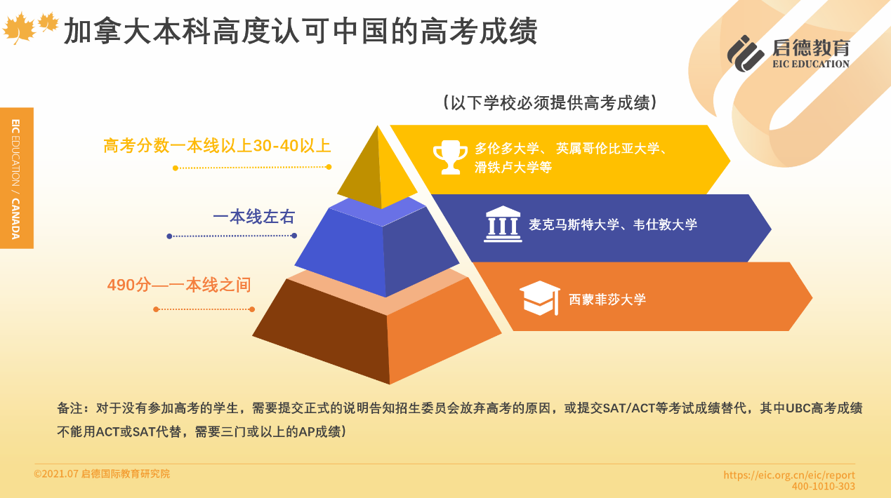 加拿大本科認可中國的高考成績,其中多倫多大學(xué)、英屬哥倫比亞大學(xué)、滑鐵盧大學(xué)等要求高考分數(shù)一本線30-40分以上,麥克馬斯特大學(xué)、韋仕敦大學(xué)要求一本線左右,西蒙菲莎大學(xué)要求490分至一本線之間。沒有參加高考的學(xué)生,需要提交正式的說明告知招生委員會放棄高考的原因,或提交SAT/ACT等考試成績替代(其中英屬哥倫比亞大學(xué)高考成績不能用ACT或SAT代替,需要三門或以上的AP成績)。
