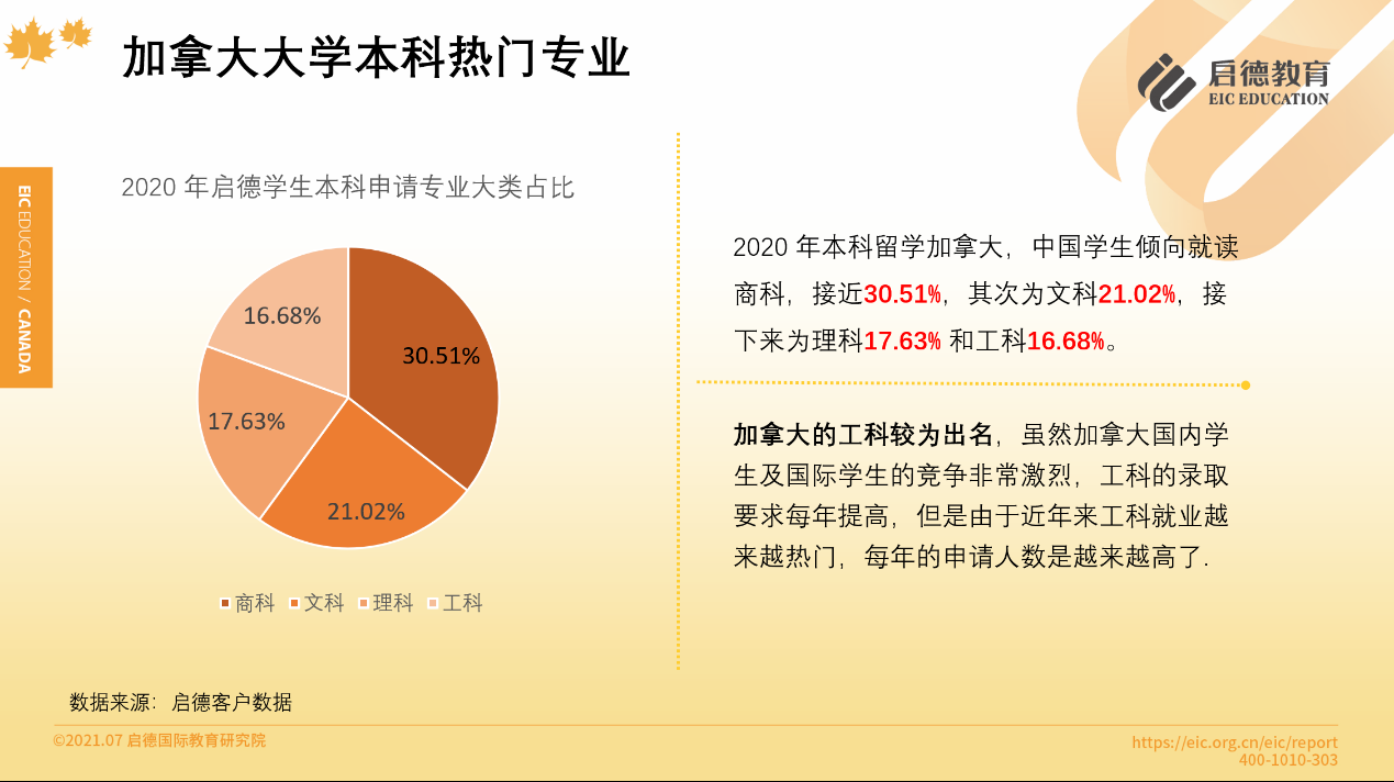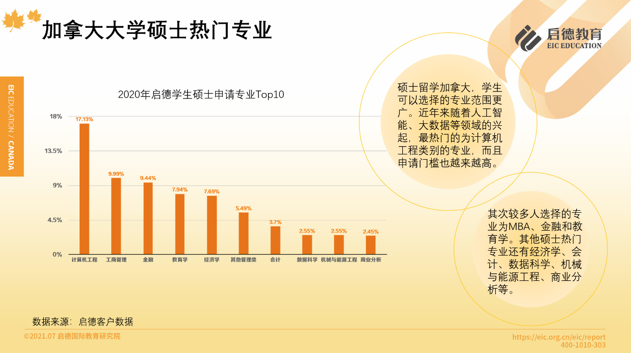 啟德留學(xué)客戶服務(wù)數(shù)據(jù)顯示,2020年加拿大本科階段,理工科專業(yè)占比34.31%,商科占比30.51%,文科21.02%,理工科的申請人數(shù)超過了商科。碩士階段選擇最多的專業(yè)是計算機工程(17.13% )、 MBA (9.99% )、金融(9.44% )與教育學(xué)(7.94% ),其他碩士熱門專業(yè)還有經(jīng)濟學(xué)、會計、數(shù)據(jù)科學(xué)、機械與能源工程、商業(yè)分析等。