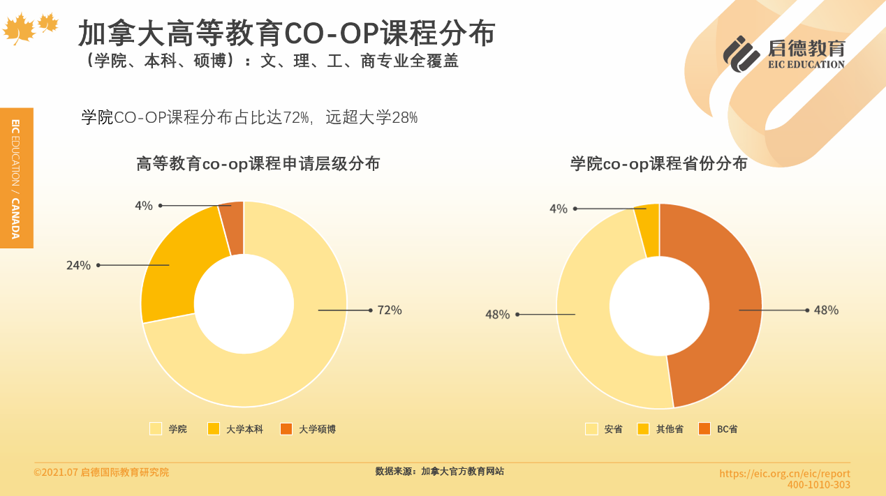 加拿大官方教育網(wǎng)站數(shù)據(jù)顯示,加拿大高等教育普遍開設(shè)覆蓋文、工、理、商全專業(yè)的 Co-op帶薪實習(xí)課程,其中學(xué)院的 Co-op課程占比最多(72% ),其次是大學(xué)本科(24% )與大學(xué)碩博(4% )。在學(xué)院 Co-op課程的省份分布上,安大略省與英屬哥倫比亞省平分秋色,各占48%。