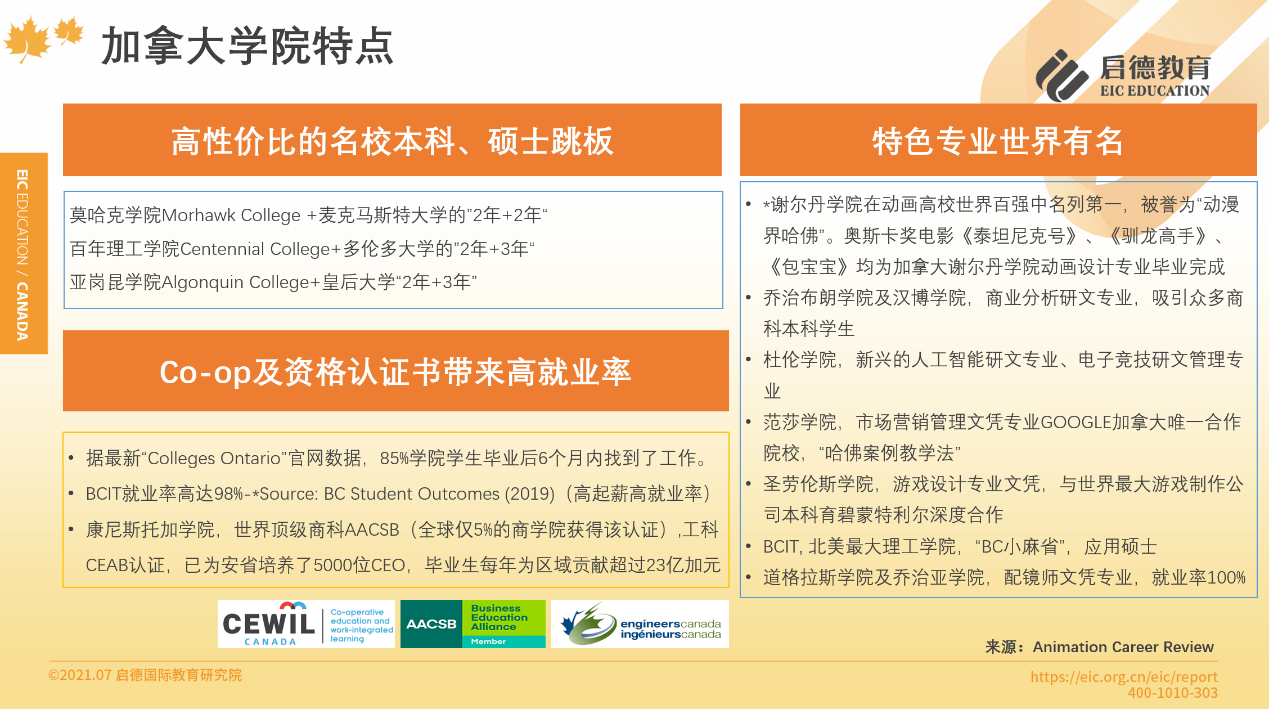 “ Colleges Ontario”官網(wǎng)數(shù)據(jù)顯示,85 %的學(xué)院學(xué)生畢業(yè)后6個月內(nèi)找到了工作,91%的雇主對學(xué)生表示非常滿意。如康尼斯托加學(xué)院,擁有世界頂級商科 AACSB與工科 CEAB認證,為安省培養(yǎng)了5000位 CEO,畢業(yè)生每年為區(qū)域貢獻超過23億加元。而奧斯卡獎電影《泰坦尼克號》、《馴龍高手》、《包寶寶》均為加拿大謝爾丹學(xué)院動畫設(shè)計專業(yè)畢業(yè)完成。杜倫學(xué)院的人工智能專業(yè),道格拉斯學(xué)院的配鏡師專業(yè)也是世界有名的特色專業(yè)。