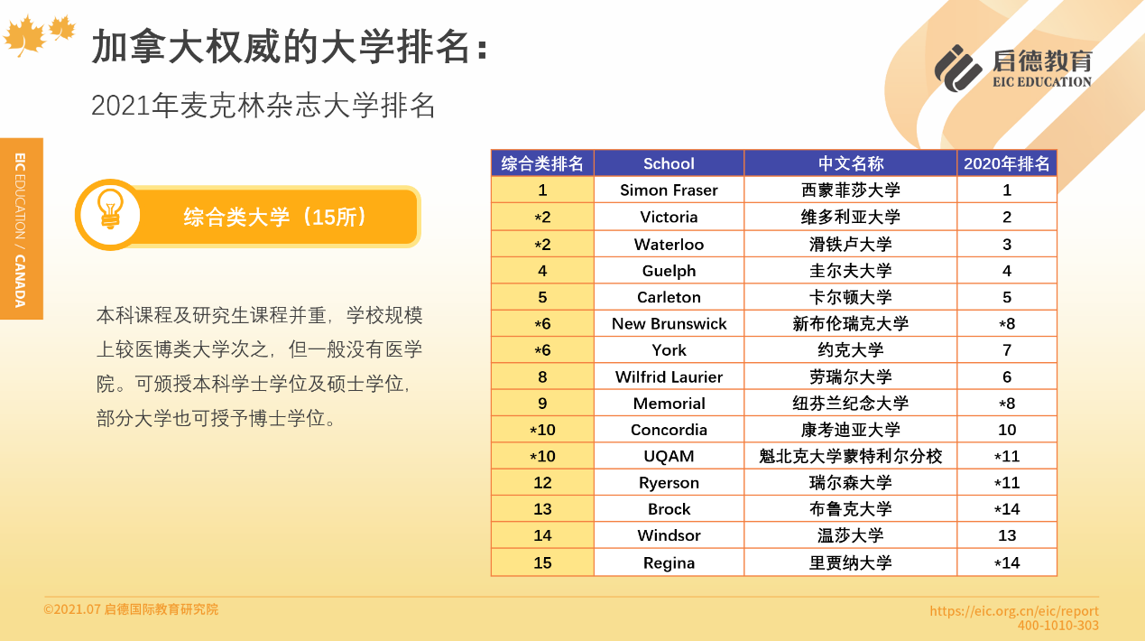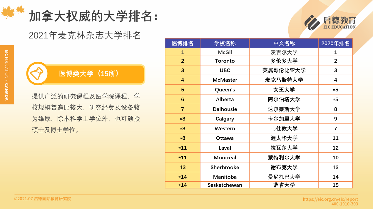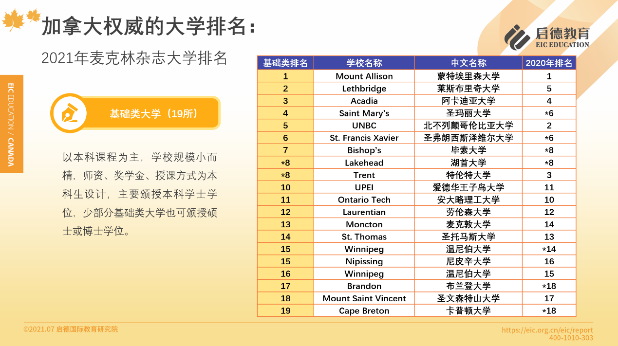 加拿大高校以公立為主,各具特色與優(yōu)勢,教育質(zhì)量在官方評價體系中并沒有顯著區(qū)別,因此,啟德教育建議,在選擇院校時,除了參考麥克林雜志排名,還應(yīng)該通過院校官網(wǎng)或者留學(xué)顧問,更全面地了解加拿大高校的實力。麥克林排名根據(jù)加拿大大學(xué)的類型,分為醫(yī)博類、綜合類、基礎(chǔ)類三個排名,值得一提的是,連續(xù)21年位于基礎(chǔ)類大學(xué)排名榜首的蒙特艾莉森大學(xué),是加拿大本科畢業(yè)生中獲得羅德獎學(xué)金人數(shù)最多的學(xué)校,羅德獎學(xué)金又被稱為“全球本科生諾貝爾獎”。此外,基礎(chǔ)類排名第19的卡普頓大學(xué),在最近一期的Analytics Insight雜志中,與美國麻省理工學(xué)院、英國華威大學(xué)等一同入選了2021年10家最著名的分析和數(shù)據(jù)科學(xué)機構(gòu)。