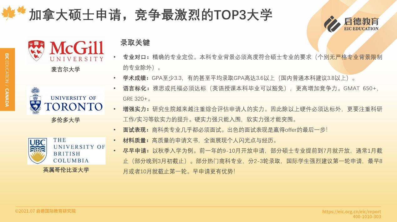 據(jù)啟德留學(xué)加拿大項目介紹,加拿大碩士申請競爭最激烈的三所大學(xué)為麥吉爾大學(xué)、多倫多大學(xué)與英屬哥倫比亞大學(xué)。申請人 GPA至少達到3.3,有的甚至要求平均錄取 GPA高達3.6以上(國內(nèi)普通本科建議3.8以上);雅思或托福必須達標(biāo)(英語授課本科專業(yè)可以豁免), GMAT650+, GRE320+;除硬件必須達標(biāo)外,加拿大名校注重科研、工作 /實習(xí)等軟實力的提升;商科類專業(yè)幾乎都必須面試。
