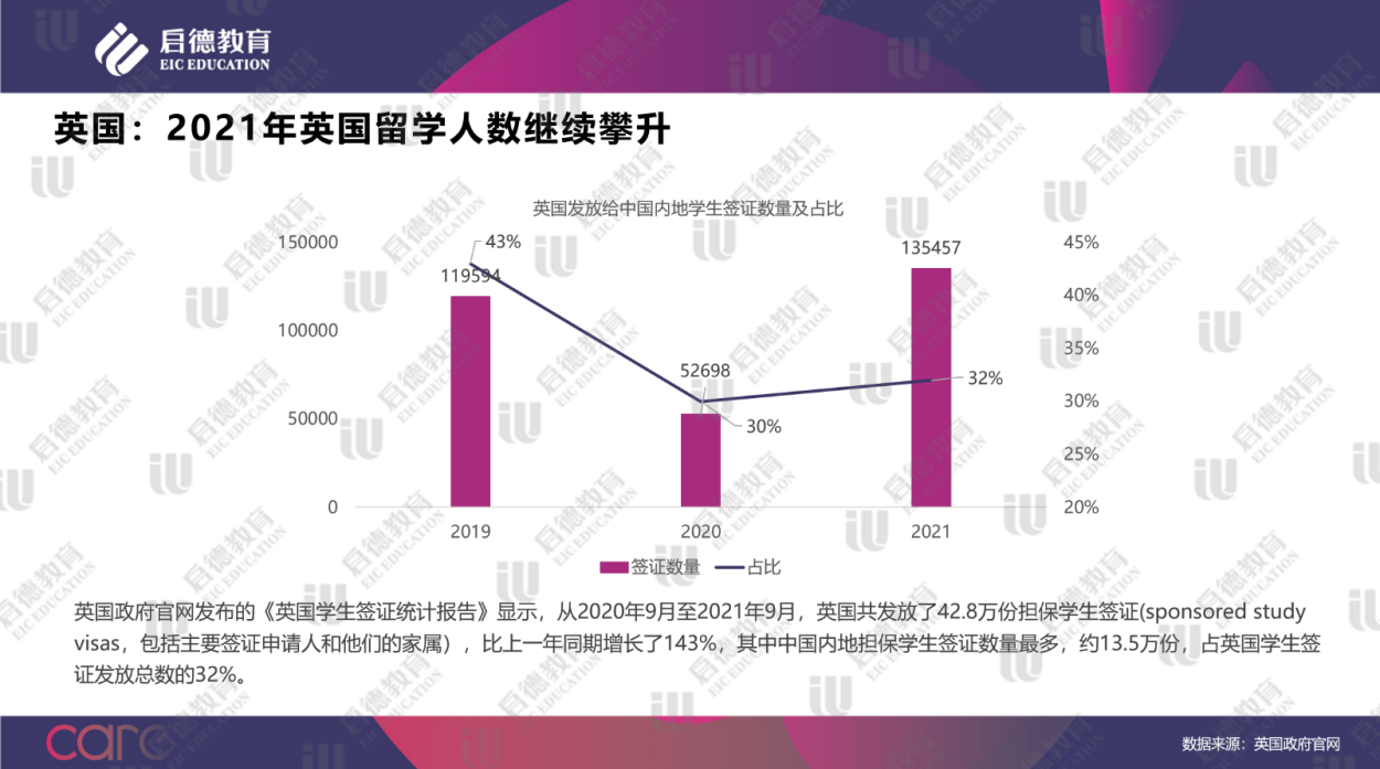 英國(guó)政府官網(wǎng)發(fā)布的《英國(guó)學(xué)生簽證統(tǒng)計(jì)報(bào)告》顯示,從2020年9月至2021年9月,英國(guó)共發(fā)放了42.8萬(wàn)份擔(dān)保學(xué)生簽證(sponsored study visas,包括主要簽證申請(qǐng)人和他們的家屬),比上一年同期增長(zhǎng)了143%,其中中國(guó)內(nèi)地?fù)?dān)保學(xué)生簽證數(shù)量最多,約13.5萬(wàn)份,占英國(guó)學(xué)生簽證發(fā)放總數(shù)的32%。