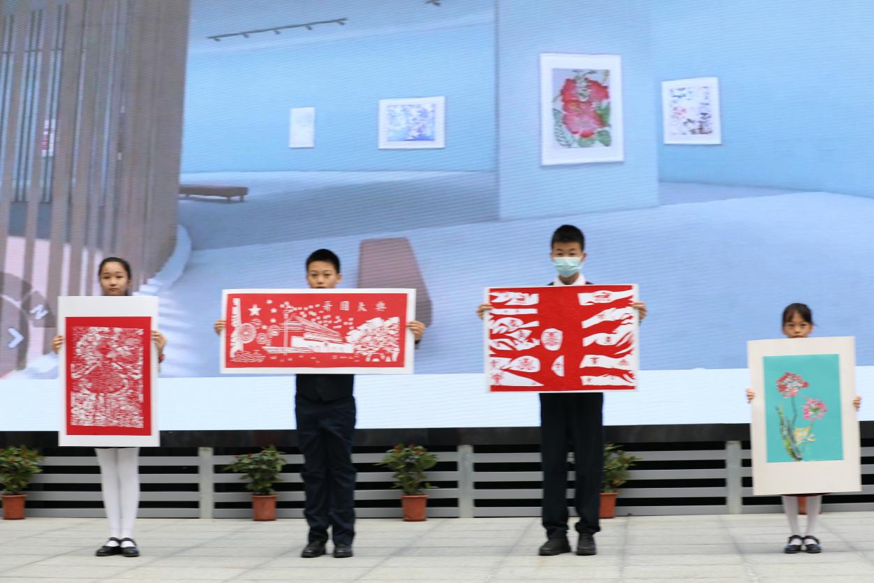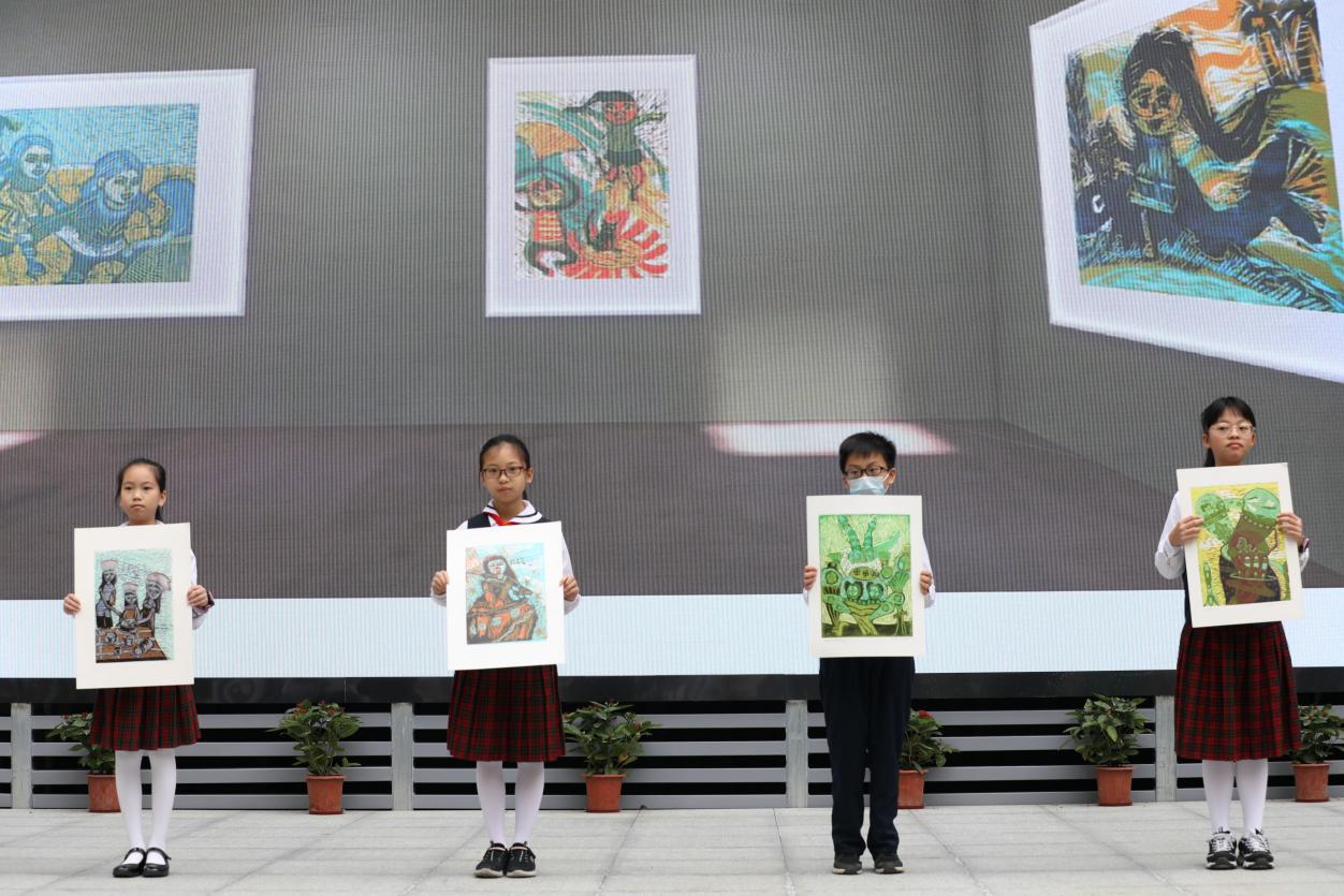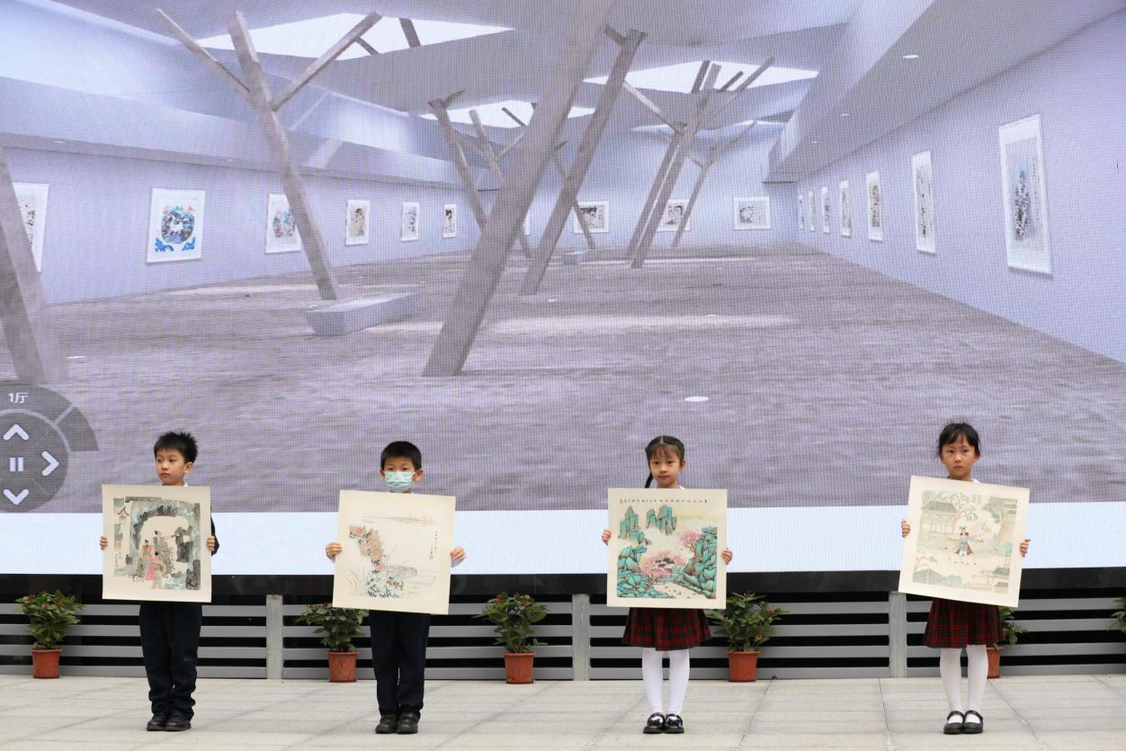 與開館和展覽同時(shí)推出的,還有“榕”美術(shù)館的云展館。云展館以新媒體形式,擴(kuò)大了展覽范圍,使得學(xué)校的美術(shù)美育成果得以向外部展示。推出之際,學(xué)校舉行了云展館的剪彩儀式。解署昱校長致辭并宣布開館,福田區(qū)教科院藝術(shù)辦林影萍主任、解署昱校長、劉權(quán)祥副校長、姚紅霞副校長為云美術(shù)館剪彩,并向全校學(xué)生贈送了云展館資料。