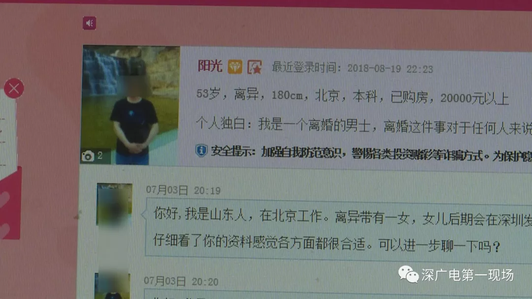張女士說,她在三年前離了婚,如今兒子已經(jīng)大學(xué)畢業(yè),想著為自己的下半生找個(gè)依靠,于是張女士便在世紀(jì)佳緣網(wǎng)站花了三百多元注冊了會員。7月初世紀(jì)佳緣網(wǎng)站上一個(gè)名叫“陽光”的北京網(wǎng)友聯(lián)系了她。
