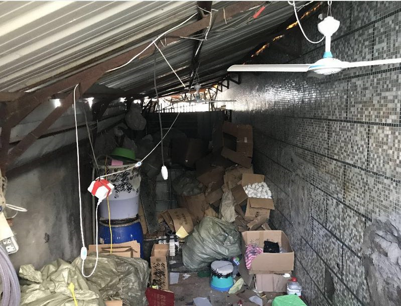 執(zhí)法人員來(lái)到位于龍東社區(qū)同昌路的一個(gè)工業(yè)區(qū)進(jìn)行突擊檢查。剛進(jìn)入該工業(yè)區(qū),執(zhí)法人員就發(fā)現(xiàn)有幾間鐵皮房大門緊鎖,通過門縫還能看到大量各品牌的洗衣粉、消毒液,以及各式設(shè)備數(shù)臺(tái)。經(jīng)檢查,現(xiàn)場(chǎng)共有這類鐵皮房3個(gè),分散在工業(yè)園區(qū)3個(gè)不起眼的角落,占地面積超過200平方米。鐵皮房?jī)?nèi)環(huán)境惡劣、電線亂搭,地上堆滿各種標(biāo)識(shí)的加工原料以及各種日化品牌的包裝袋,數(shù)量巨大。