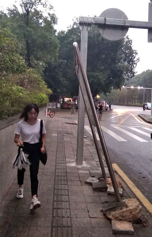 存在安全隱患的不僅電線桿,記者在蓮花山公園附近一人流量較大的十字街頭發(fā)現(xiàn),有一塊交通路牌也被“山竹”吹的東倒西歪,其底部根基已經(jīng)翻出一半,讓人擔(dān)心其會隨時倒下、危及過往路人安全。“我每天上下班都會經(jīng)過這里,騎著車又不得不走路牌內(nèi)側(cè),每次都有點(diǎn)小怕,擔(dān)心牌子會突然倒下砸到我?!备浇木用裣蛴浾咄虏鄣?。