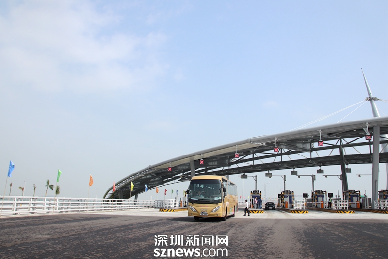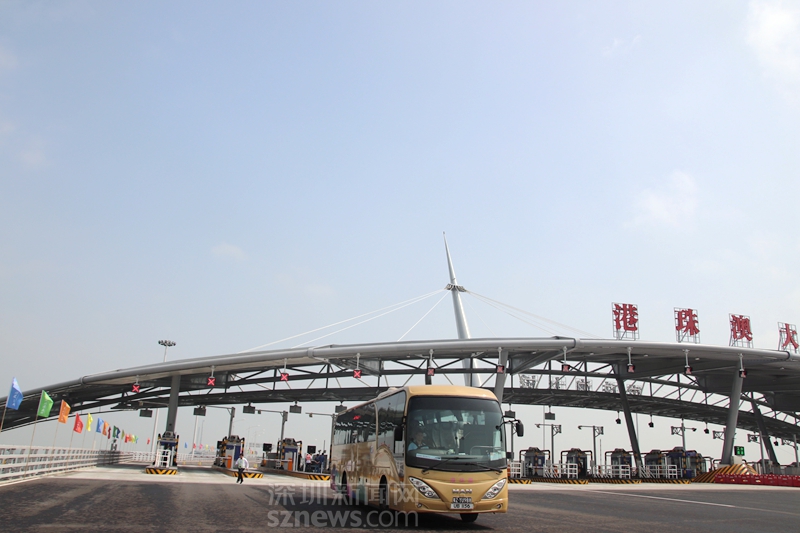一輛穿梭巴士經(jīng)過港珠澳大橋珠海收費(fèi)站