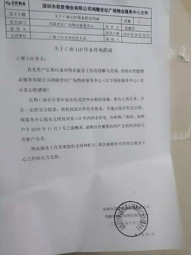 10月30日鴻隆世紀(jì)廣場物業(yè)服務(wù)中心物業(yè)發(fā)出關(guān)于 C座11D停水停電函,表示 C座存在青年旅社形式對外出租的現(xiàn)象,室內(nèi)人員居多,存在安全隱患,按桂園派出所有關(guān)要求,不建議旅社形式出租。業(yè)主授權(quán)物業(yè)中心對11D進(jìn)行室內(nèi)停水停電,協(xié)助租戶離場,并要求租戶于11月1日之前搬離。