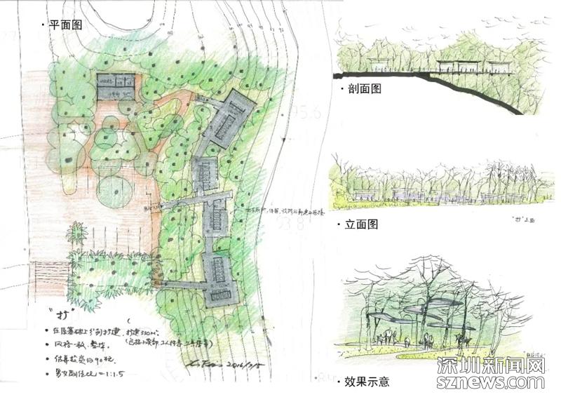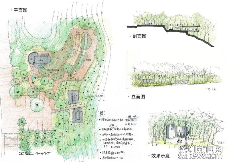 費曉華在文中提到,“隨著深圳人口和游客的劇增,蓮花山頂公共廁所已不堪負重,急需擴大規(guī)模。2016年,本人受蓮花山公園管理處的邀請,免費為他們提供了改擴建方案。方案共有兩種思路:‘隱擴’和‘顯擴’,均是在保留原建筑的基礎上,擴大使用面積以滿足更多人的需求。從更好地保護自然環(huán)境的角度出發(fā),本人推薦‘隱擴’方案?!?(附設計圖)