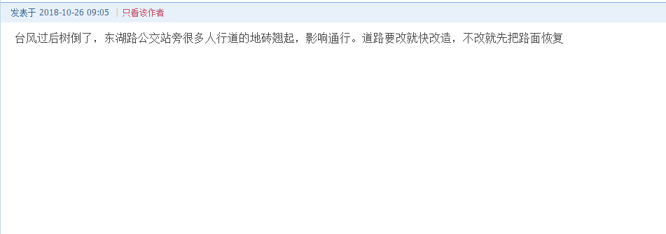 “再補一張,到2019年啦?!痹摼W友在發(fā)帖后的幾小時內,又補發(fā)了一張寫有“2019年實施,2019年完工”的截圖。并配圖表示“臺風過去快2個月了,東湖路的人行道石磚仍大片凸起,地鐵站前面的道路凹凸不平,從來沒有人來處理?!?/p>