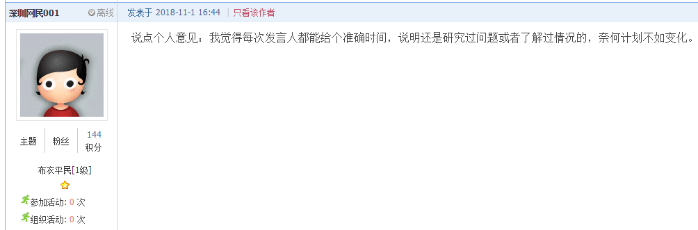 縱觀該帖文,網友將2017年以來的文字截圖一一呈現,“有圖有真相”的質疑羅湖區(qū)相關政府部門。但,就如上圖網友所言,不管面對何事,都應當讓“理解”先行。只是當市民給予了一定理解之后,也希望相關部門信守承諾,盡量避免屢次爽約,畢竟政府部門的信用是靠其一言一 行來建立的。