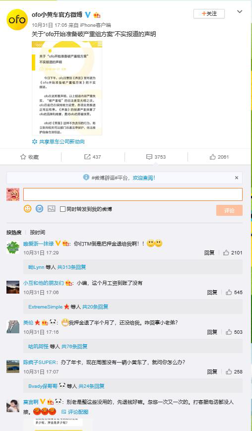 今年10月底,《界面》新聞發(fā)布題為《ofo開始準(zhǔn)備破產(chǎn)重組方案》的報道。當(dāng)日,ofo官微稱該報道嚴(yán)重失實,將訴諸法律維護(hù)自身合法權(quán)益。