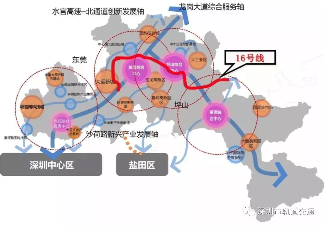 深圳地鐵16號線聯(lián)系大運新城、龍崗中心城、坪山站及坪山新區(qū)等地區(qū),是東部組團內(nèi)部的軌道線路。線路全長約29.2公里,設站24座。線路由大運站引出,沿龍崗大道、黃閣路、龍平路敷設,經(jīng)龍崗老中心后沿深汕公路往南至坪山站,經(jīng)坪山中心區(qū)后沿東縱路、金田路等路敷設至終點田心。地鐵的建設不管在經(jīng)濟上還是民生方面對整體坪山區(qū)的發(fā)展意義重大。