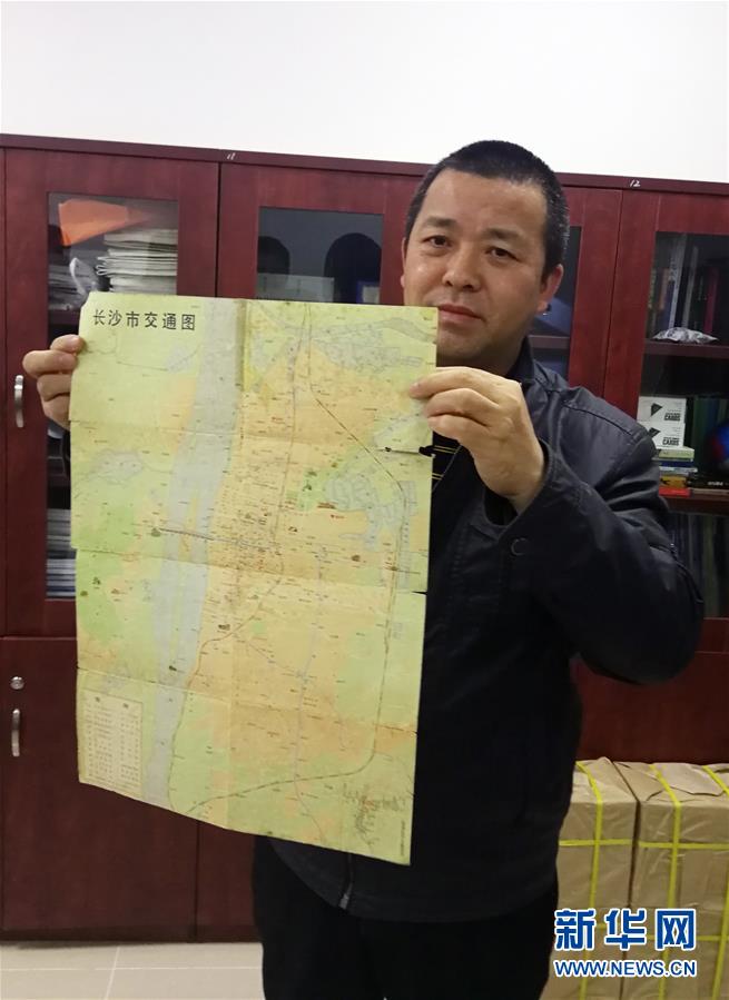 10月23日,蔣連軍向記者展示他收藏的改革開放初期的長(zhǎng)沙城區(qū)地圖。 湖南地圖出版社注冊(cè)測(cè)繪師蔣連軍愛(ài)好地圖收藏,累積了40多張40年來(lái)多個(gè)版本的長(zhǎng)沙城區(qū)地圖。10月23日,記者看到了這些地圖,它們直觀呈現(xiàn)了改革開放40年來(lái)長(zhǎng)沙城的變遷發(fā)展。 新華社記者 段羨菊 攝
