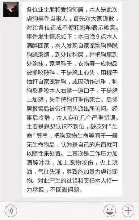當(dāng)天深夜,男子在業(yè)主群中道歉,稱自己晚上9點(diǎn)醉酒回家,發(fā)現(xiàn)自家寵物狗掙脫狗鏈,到處拉屎還將家里的鞋子、衣物撕咬破碎,抽打自家寵物狗時(shí),又被反咬一口,才會失手將狗打成重傷,同時(shí)男子表示“對此產(chǎn)生的過錯和責(zé)任本人將一力承擔(dān),不回避問題?!?/p>