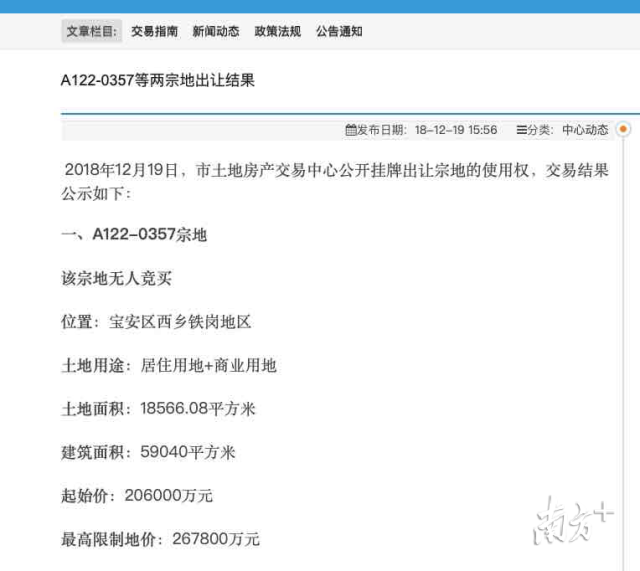 記者12月19日查閱深圳市土地房產(chǎn)交易中心官網(wǎng)信息顯示,A122—0357宗地出讓結(jié)果為無人競買。