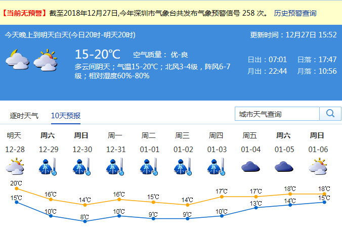 記者從深圳市氣象局了解到,27日晚上到28日白天(今日20時-明天20時)氣溫在15-20℃,空氣質(zhì)量優(yōu)-良,深圳市以多云間陰為主天;北風(fēng)3-4級,陣風(fēng)6-7級;相對濕度60%-80%。