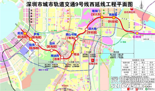 據(jù)了解,地鐵9號線西延線東起紅樹灣南站,經(jīng)深圳灣至前海灣,終點(diǎn)為前灣站,與5號線南延線換乘。線路全長約10.8千米,設(shè)車站10座,全線采用地下敷設(shè)方式。
