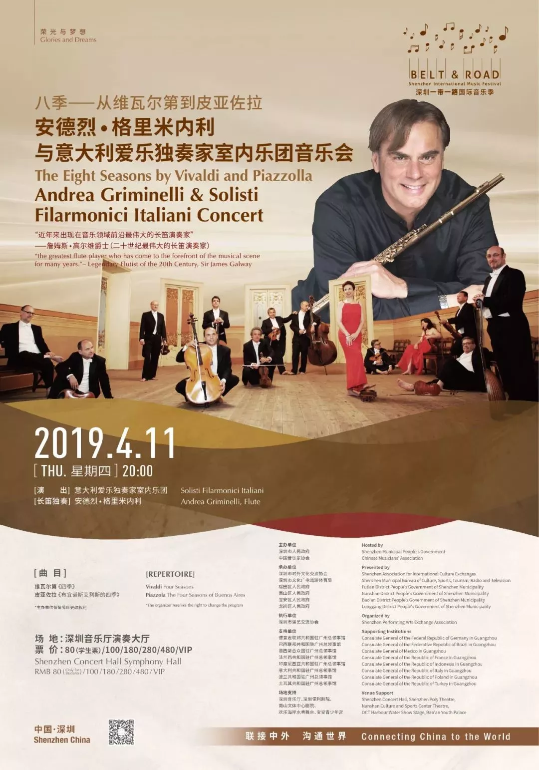 長笛名家安德烈 格里米內(nèi)利,世界三大男高音之一帕瓦羅蒂推崇的長笛大師,攜意大利愛樂獨奏家室內(nèi)樂團(tuán),首次到訪深圳,用音樂鏈接跨越時空的《四季》。