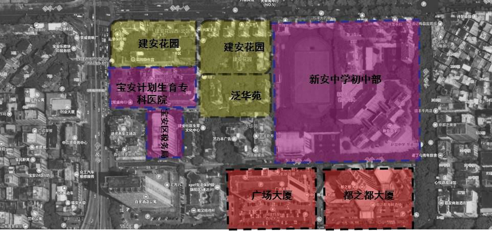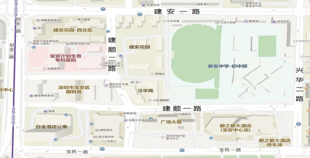 新安中學初中部片區(qū)位于寶安區(qū)新安街道,由建安一路、創(chuàng)業(yè)二路、寶民一路與興華二路四條道路圍合而成,面積約0.13平方公里,區(qū)域內(nèi)部有建順一路、建順二路以及建順二路一巷等支路。