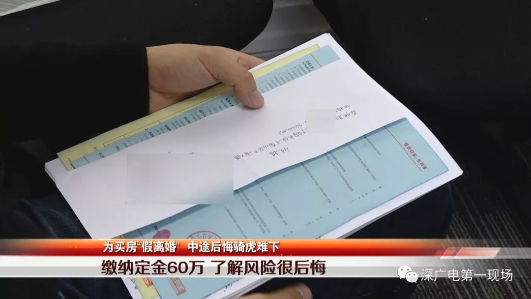 王先生:“中介說可以辦理假離婚,而且可以把假離婚手續(xù)辦到兩年前,首付就可以三成,我們當時求房心切,就采取了信任對方?!?/p> 繳納定金60萬了解風險很后悔
