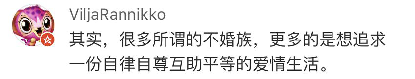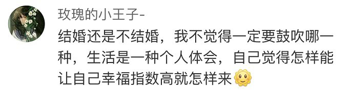 一定要遇到理想的結(jié)婚對(duì)象才會(huì)選擇結(jié)婚。事業(yè)排第一,婚姻排在最后。我進(jìn)入婚姻的初衷是為了讓生活變得更好,而且婚姻更多還是一種合作關(guān)系,兩個(gè)人在一起能夠提高生活品質(zhì),經(jīng)濟(jì)方面相互幫助,降低生活成本,增強(qiáng)風(fēng)險(xiǎn)抵抗能力。身邊朋友未婚的比較多,但有時(shí)看到已婚的朋友生活幸福,會(huì)有短暫的焦慮感,但更多地受到父母不幸的婚姻生活的影響,我對(duì)婚姻基本沒有什么正面的期望。