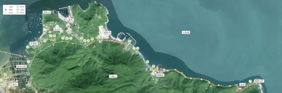 大鵬新區(qū)根據線路的地形、山海景觀、人文景觀的分布,確定了“打造‘兩線、三段、五大節(jié)點’的濱海生態(tài)自然課堂步道”。據新區(qū)建筑工務局負責人介紹,從新大河入??诘酱髞啚澈0堵咕讘已拢L18.7公里的海岸線上分布著河流、山林、海灘、溪流、濕地等多樣生態(tài)系統。2017年7月,大鵬新區(qū)按照濱海慢行系統示范工程標準,動工建設新大-鹿嘴市政綠道?!皟删€”指的是沿著海岸的濱海徒步路線和城市二號綠道線,兩條線之間的6.6平方公里土地將形成一座開放的郊野公園;“三段”分別為活力生活段、自然生態(tài)段和休閑旅游段;“五大節(jié)點”為山海綠畔、古廟遺風、東山凹、愛情灘、鹿咀山莊等自然景觀。