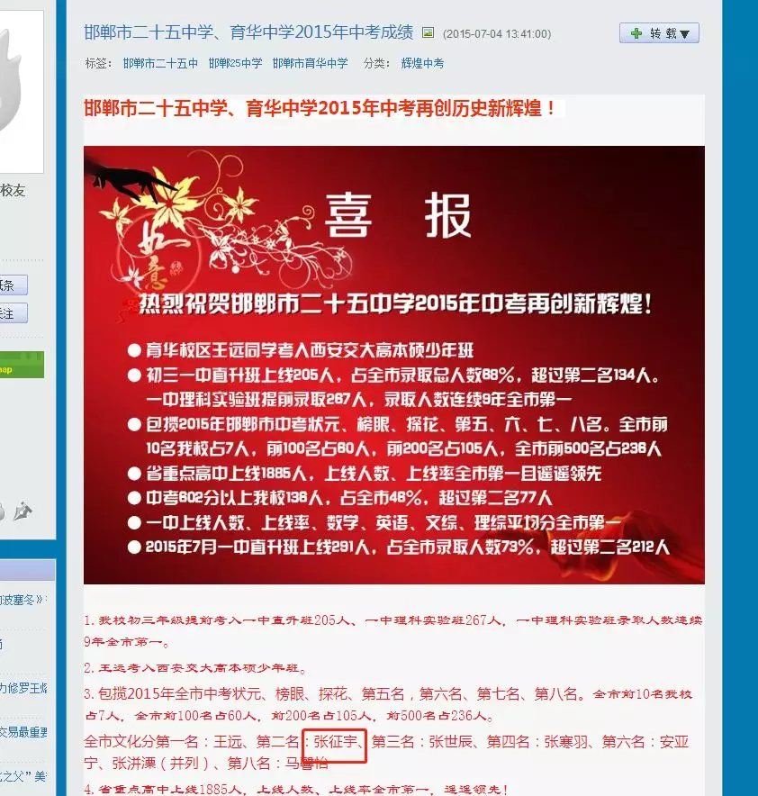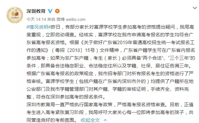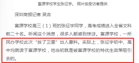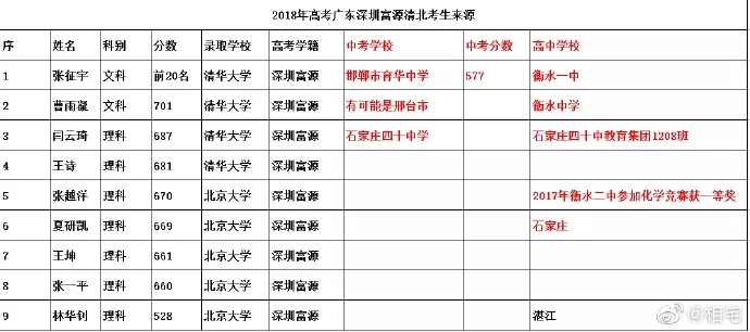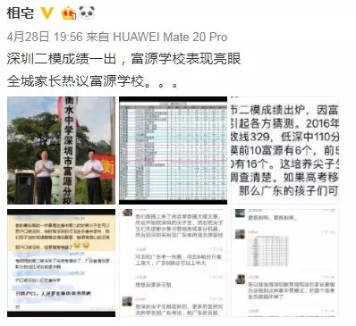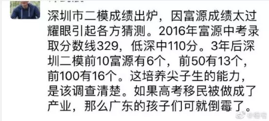 近日,深圳高三二模成績出爐,一所學校引起了深圳家長圈的高度關注。 有網(wǎng)友在微博上報料富源學校表現(xiàn)亮眼,一石激起千層浪,事件是怎么一回事呢?一起來看看 2019深二模各校尖子生成績 其中民辦學校寶安區(qū)富源學校異軍突起,尖子生占比遠超深圳最好的四大高中(深圳中學,深圳實驗中學,深圳外國語學校,深圳高級中學),引人注目。 網(wǎng)友議論紛紛 網(wǎng)友@相宅稱:深圳富源中學,18年考中清北的學生名單和初中來源統(tǒng)計,經(jīng)過人肉搜索和大數(shù)據(jù)比對,確認相關證據(jù),有非常大的高考移民嫌疑。廣東高考本來就難,名校指標更少,還來擠占惹起公憤。同時附上19年深圳高考二模的富源成績。今年還有沒有高考移民,還會不會擠占廣東的名校指標? 針對網(wǎng)上的報料和家長的質疑,深圳教育局@深圳教育回應稱 情況說明 #情況說明#昨日,有部分家長對富源學校學生參加高考的資格提出疑問,我局高度重視,立即啟動調查。經(jīng)核實,富源學校在我市申請高考報名的學生均符合廣東省高考報名資格。根據(jù)《關于做好廣東省2019年普通高校招生統(tǒng)一考試報名工作的通知》(粵招〔2018〕15號)文件精神,廣東省戶籍學生可在廣東省內報名參加高考;如果為非廣東戶籍,考生(家長)必須具備“兩個合法”、“三個三年”的條件,即具備合法穩(wěn)定職業(yè)、合法穩(wěn)定住所以及學籍、社保、居住證各滿三年。根據(jù)廣東省高考報名的政策規(guī)定,我市招考部門對所有報名考生的資格進行了嚴格審核。富源學校學生(包括戶籍在廣東省內深圳市外的)均提供了戶籍所在地公安部門及我市學籍管理部門對其戶籍、學籍的審核證明,手續(xù)齊全、資料完整,符合在深圳參加高考的報名條件。 深圳市教育局一直嚴格執(zhí)行國家高考政策,嚴格高考報名資格審查。目前,正值考生進入高考緊張復習階段,我局呼吁大家關心每一位即將參加高考的孩子,共同營造良好的考前氛圍。 回應之下,小編根據(jù)現(xiàn)有的資料,發(fā)現(xiàn)了這些信息出入,一起接著往下看! 對比:富源學校深圳一模成績 成績單顯示,在前十名單里,富源學校獨占6位,而深圳四大公辦重點高中總和也只有4位,這是什么情況?對照看一看一模成績: 三年來深圳中考錄取情況: 富源學??梢娚床徽純?yōu)勢 再來看一看三年來深圳中考錄取情況:富源學??梢娚床]有什么優(yōu)勢,總分460分的錄取分數(shù)比四大重點低了將近100分,但也不能因此說明該學校沒有尖子生源。 2018年富源學校高考清北名單:9位同學上清北 下圖是2018年幾所大學在廣東(理科)招生計劃: 但是,這幾名考進清北的同學,名字竟然出現(xiàn)在兩所不同的高中??? 考進廣東前20名的張征宇同學 網(wǎng)友爆料稱,深圳富源中學2018年高考喜報,特別宣傳了張征宇同學(后成功考入清華大學)。而他也出現(xiàn)在2015年的邯鄲市育華中學中考喜報上。乾坤大挪移,坐地日行八萬里! 家長質疑:富源中學光榮榜的同學 怎么又出現(xiàn)在衡水中學喜報上? 針對上面9位同學,搜索信息顯示,竟然有五位同學來自有名的高考大省河北。 在2018年的第31和32屆化學奧林匹克競賽的名單上,有一個共同的名字:崔一龍,但他們來自不同的學校。高二時他在衡水第一中學,高三他出現(xiàn)在深圳富源中學。 同時,該網(wǎng)友還發(fā)了一封 #一位深圳中學生家長寫給教育部的控訴信# 尊敬的國家教育部領導: 您好! 我是深圳市一名中學生的家長。這幾日網(wǎng)上流傳出一份深圳市高三年級第二次模擬考試前幾名學校分布成績單,其中民辦學校寶安區(qū)富源學校異軍突起,遠超深圳最好的四大高中(深圳中學,深圳實驗中學,深圳外國語學校,深圳高級中學)引起廣大家長的關注。隨后網(wǎng)上流傳出是富源學校與河北衡水中學之間的高考移民消息,具體操作是通過將河北衡水中學的尖子生戶口轉移到深圳富源學校,平時在衡水中學上課,考試在深圳富源學校,并參加深圳市高考。此情況幾年前已有,數(shù)量沒有那么大。今年突然大量此類考生出現(xiàn),大家猜測,如果不加管控未來必將愈演愈烈。 作為一名普通深圳市民和學生家長,我守法遵紀,但是實在難以接受這樣的現(xiàn)實。希望教育部能夠徹查此事,查明真相,還廣大家長和考生一個公道。 記者調查 網(wǎng)上傳出深圳高三二模數(shù)據(jù)圖,記者向深圳某中學老師證實了該表格的真實性。從數(shù)據(jù)中可看到,深圳二模全市前十共有11名,其中富源6名,深圳中學3名,深圳實驗學校和市高級中學各占1名。有家長質疑這是富源學校從衡水中學引入了高考移民,才導致二模成績一下子拔尖,并已申請要求有關部門徹查。 同時,小編梳理去年的報道發(fā)現(xiàn),張征宇同學此前的采訪顯示:張征宇初中、高中均就讀于富源學校,他當初就是被富源學校的特優(yōu)生政策吸引去的。 但是記者調查發(fā)現(xiàn),張征宇同學的名字出現(xiàn)在邯鄲市2015年中考喜報上。 此外,網(wǎng)上現(xiàn)正流傳富源模式:一方面從衡水挖學生過來利用深圳入戶容易這一點搞成深戶,在深圳高考,另一方面招深圳的孩子,學籍掛在深圳,送去衡水上課,再回深圳高考。 【這四大謎團仍待解】 盡管教育部門通報稱,經(jīng)核實,富源學校在深圳申請高考報名的學生均符合廣東省高考報名資格。