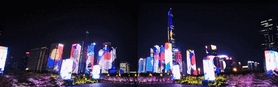 樓體的燈光和音樂同步登場